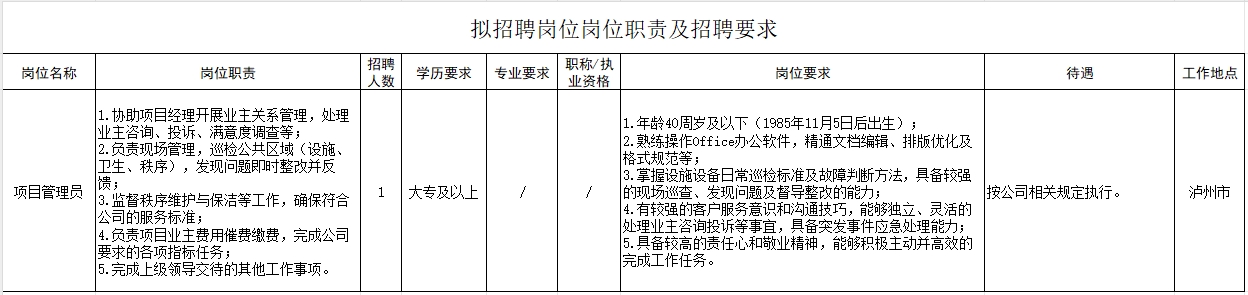 附件:泸州兴泸智慧城市生活服务管理有限公司公开招聘岗位需求表